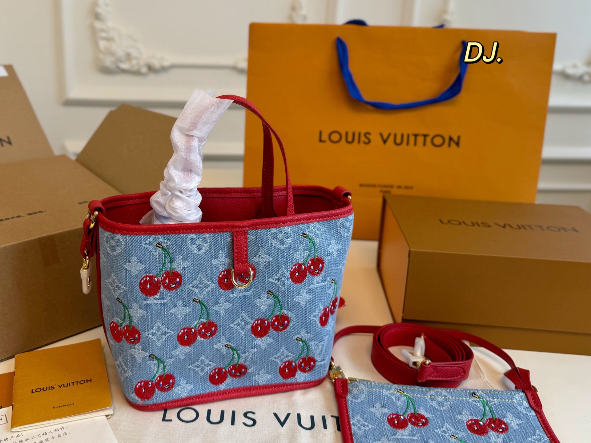 size: 19×16 LV Louis Vuitton Takashi Murakami Cherry Double-sided neverfull BB Shopping Bag